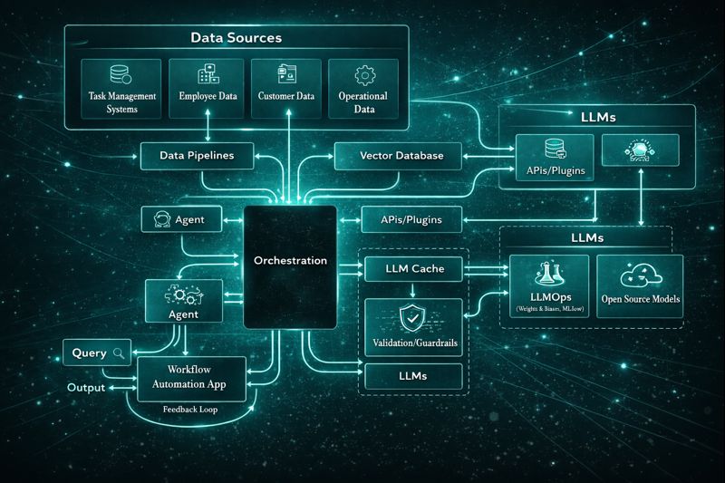 We start by bringing together information from across your organization—task management platforms, employee databases, customer systems, and operational tools. Instead of data sitting in silos, everything flows into a unified system that AI can access and understand.